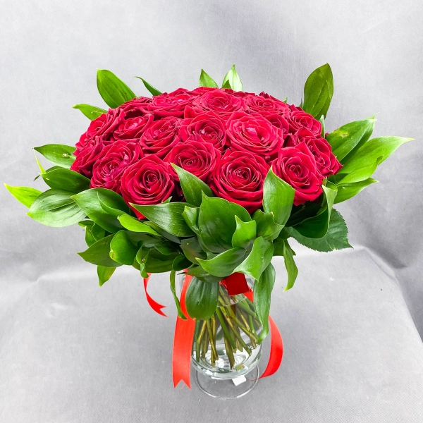 25 роз: роза красная (70см) - 25 шт., рускус (или салал/ малина/фисташка) - 13 шт., упаковка, лента.