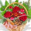 Стандартный: роза красная - 3шт., хризантема красная ромашковидная кустовая - 2шт., рождественские леденцы - 5шт., гипсофила, декоративная зелень, еловая ветвь, корица, новогодний декор, оазис, средняя корзина.